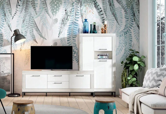 Composición de salón estilo nórdico. Colores Albo / Blanco Mate. Pata marco